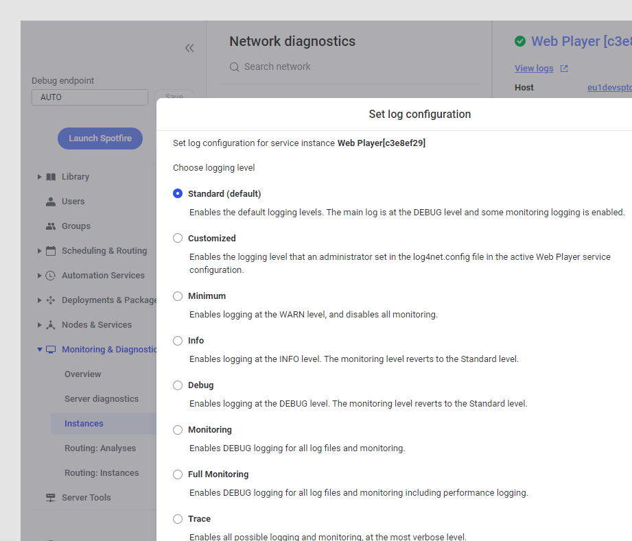 For Automation Services and Web Player service instances, you can switch to a more complete logging level from within the Monitoring & Diagnostics area of the Spotfire Server web administration interface .