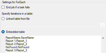 If a task fails within a loop, you can select if the job should continue with the next iteration, or if the whole job should end. In the Automation Services Job Builder, a warning will be shown if the table or the external file is incorrect.