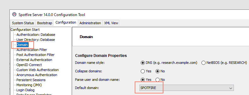 The Configuration page of the configuration tool shows the authentication type and the user directory for your installation. These instructions are for using the Spotfire database to authenticate users.