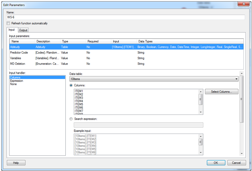 You can configure the handlers for input and output parameters in a Data Function. Editing parameters is an optional step. Statistica data functions can be run without editing any parameters.