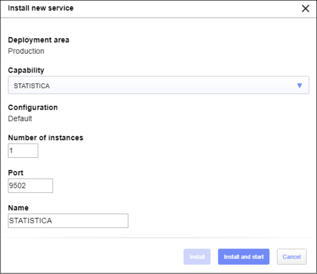 - In the Install new service dialog box, choose the Statistica capability, and verify the information in the autopopulated fields, and click Install and Start.