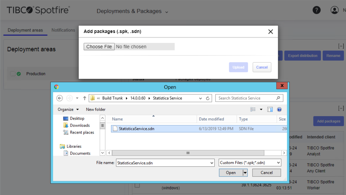 - In the Add packages dialog box that opens, browse and select the Statistica Service file (.sdn or .spk) and click Upload.