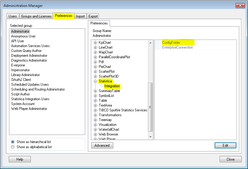 The Statistica extension registers a ConfigFolder preference that can be administered at a server level. A value provided for ConfigFolder here serves as the default value for the Configuration setting for all instances of Spotfire Analyst that connect to the current server. The user can override the default by selecting a folder through the Settings tab. The files in this folder that have valid structure and content are used to override defaults.