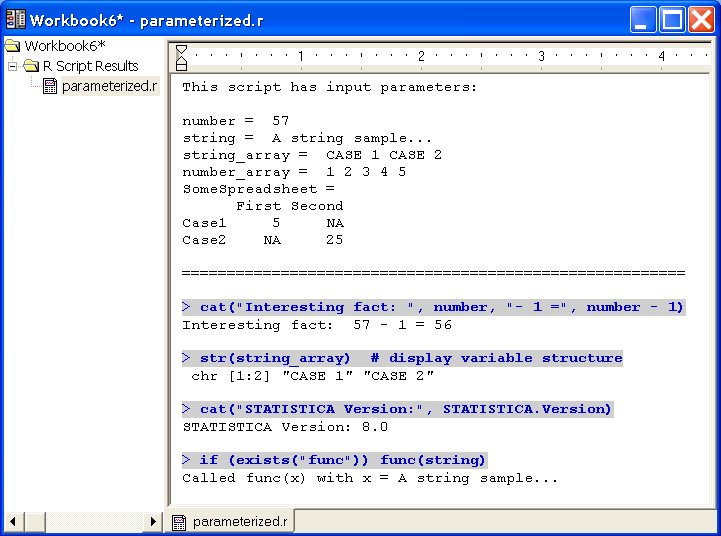 R Integration supports the following types of named parameters: strings, numbers, arrays, and spreadsheets. Support for Statistica Spreadsheets is particularly useful: for example, such a parameter can override the ActiveDataSet keyword, allowing a single script to serve as an R engine for an interactive module, Enterprise analysis configuration, and Workspace node implementations.