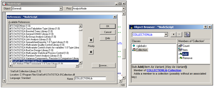 In order to use Collection objects, SVB scripts must include a reference to the TIBCO Statistica Collection Library (add it using the Tools > References menu while editing the macro):