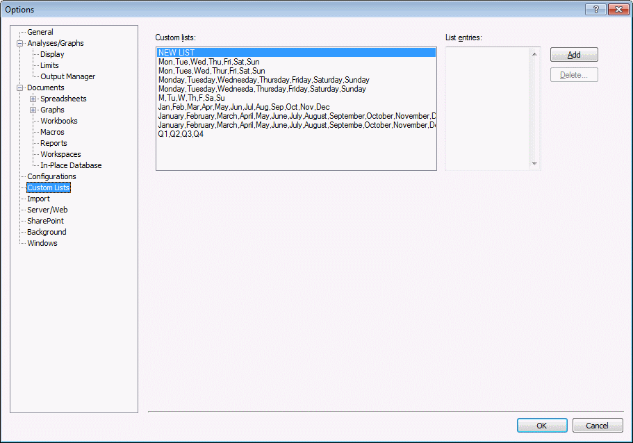 To create a new list, select NEW LIST, and enter the list items for it in the List entries box. After you have added all the items for the new list, click the Add button, and the list is added to those in the Custom lists box.