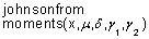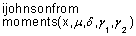 | JohnsonFromMoments | Computes the density of the Johnson distribution (curve) defined by moments Mean, StandardDeviation, Skewness, and Kurtosis, for the Johnson variate value x. Note that this can be computationally expensive, because the actual parameters for the respective best-fitting Johnson curve will have to be computed from the moments, every time this function is invoked. | JohnsonFromMoments( x, Mean, StandardDeviation, Skewness, Kurtosis) | ||