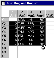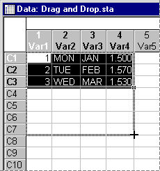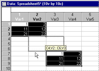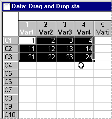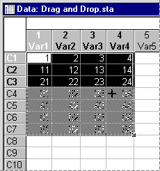 Statistica Spreadsheets support all standard spreadsheet (Excel-style) block drag-and-drop operations (copy, move, insert, etc.) and block extension operations, as well as mouse pointer-controlled column width, variable-speed scrolling, and split scrolling.