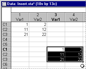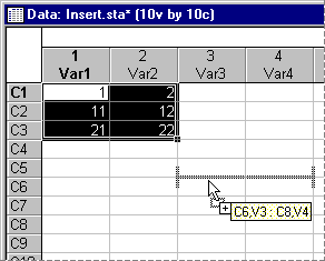 To insert a block between columns or rows, point to the border of the selection (the mouse pointer changes to an arrow), then drag the selection while pressing the SHIFT key. If you point between rows, an insertion bar appears between the rows, and when you release the mouse button, the block is inserted between those two rows [creating new case(s)]. If you point the cursor between columns, an insertion bar appears between the columns, and when you release the mouse button, the block is inserted between those two columns [creating new variable(s)]. Note that if you also press the CTRL key while you are dragging the selection, the block is copied and inserted instead of moved and inserted; a plus appears next to the arrow-cursor, as shown in the illustration below.