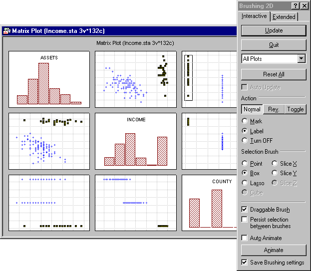 A "typical" illustration of the use of brushing in exploratory data analysis is the examination of the contribution of data points representing different ranges or different levels of one variable to correlations between other variables, which can be inspected visually using a scatterplot matrix. For example, by including a categorical, three-level variable such as income level (Income) in a scatterplot matrix, then by using the Box, Lasso, or Slice X brush, points can be selected from one income level, and the location of these points in scatterplots of all other variables (e.g., Assets, Debt) becomes immediately apparent.