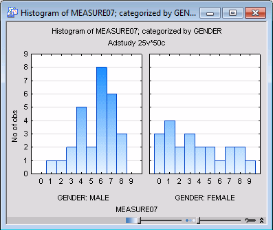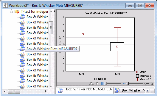 The graph shows something unexpected: The variation in the group of females appears much larger than in males. If the variation of scores within the two groups is in fact reliably different, then one of the theoretical assumptions of the t-test is not met (see the Introductory Overview), and you should treat the difference between the means with particular caution. Also, differences in variation are typically correlated with the means, that is, variation is usually higher in groups with higher means. However, something opposite appears to be happening in the current case. In situations like this one, experienced researchers would suspect that the distribution of Measure07 might not be normal (in males, females, or both). However, first look at the test of variances to see whether the difference visible on the graph is reliable.