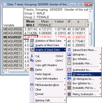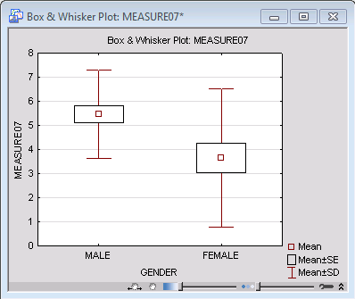 Reviewing the t-test output. The quickest way to explore the table is to examine the fifth column and look for p-values that are less than the conventional significance level of .05 (see Elementary Concepts). For the vast majority of dependent variables, the means in the two groups (Males and Females) are very similar. The only variable for which the t-test meets the conventional significance level of .05 is Measure07 for which the p-value is equal to .0087. A look at the columns containing the means (see the first two columns) reveals that males used much higher ratings on that scale (5.46) than females (3.63). The possibility that this difference was obtained by chance cannot be entirely excluded, although assuming that the test is valid (see below), it appears unlikely, because a difference at that significance level is expected to occur by chance (approximately) 9 times per 1,000 (thus, less than only 1 time per 100). This result will be examined further, but first, look at the box and whisker plot for this variable.