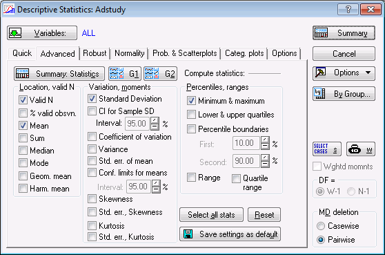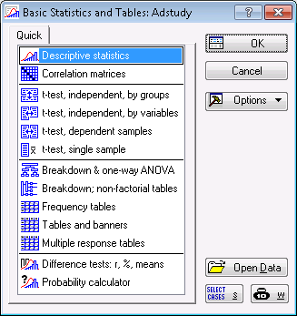 Open the Adstudy.sta data file, and start the Basic Statistics and Tables module.