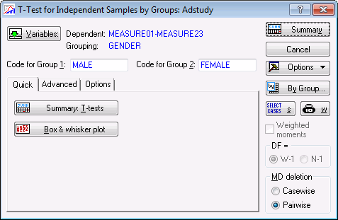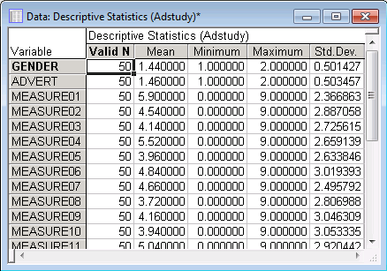 This example is based on the Adstudy.sta example data file that is included with Statistica. The data file contains 25 variables and 50 cases. These (fictitious) data were collected in an advertising study where male and female respondents evaluated two advertisements. Respondents' gender was coded in variable 1 (Gender: 1=MALE, 2=FEMALE). Each respondent was randomly assigned to view one of the two ads (Advert: 1=COKE®, 2=PEPSI®). They were then asked to rate the appeal of the respective ad on 23 different scales (Measure01 to Measure23). On each of these scales, the respondents could give answers between 0 and 9.