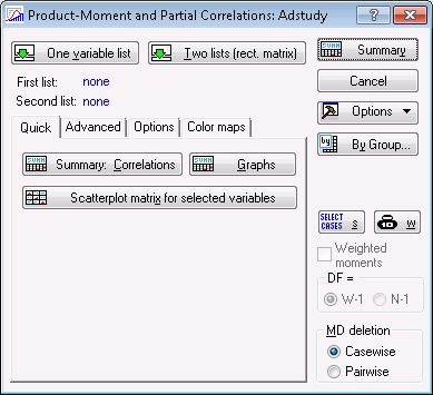 Product-Moment and Partial Correlations dialog box are used to produce results spreadsheets with the correlation coefficients and also more detailed statistics (e.g.,