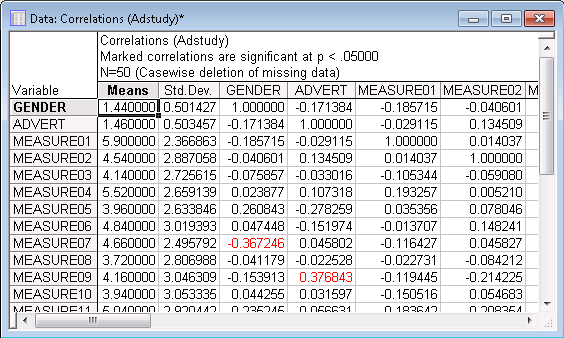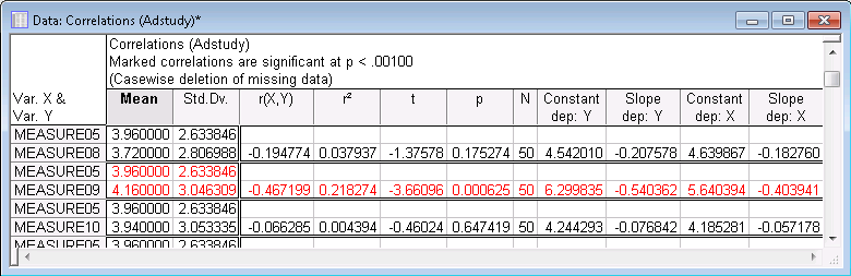 Click the Summary button again to display the updated results spreadsheet in which all correlations that meet this significance criterion will be highlighted. It is very easy to spot these high correlations (for example in this spreadsheet, the correlation between Measure05 and Measure09 is -.47). This high correlation indicates that those two rating scales may measure similar aspects of the viewers' perception of the advertisement (although one is a decreasing and the other an increasing measure of that aspect).