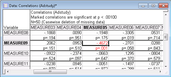 This option should be used to examine only specific correlations (and not for exploratory data analysis) because 22 spreadsheet cells are occupied for each correlation coefficient in this format; thus, a 20x20 correlation matrix produces a spreadsheet with 8,800 cells. As you can see above, the correlation for Measure05 and Measure09 is highly significant (p=.0006), which means that the error associated with accepting this result is only 6 in 10,000. Technically speaking, if we were to draw samples of the current sample size at random from a population in which those two variables are not correlated, then only six times in every 10,000 drawings would a sample be obtained in which the correlation was -.47 or stronger (i.e., in this case, more negative, see Elementary Concepts).