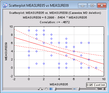 Producing a scatterplot. In order to visualize the correlation between variables, display the Product-Moment and Partial Correlations dialog box again, select the Advanced tab, and click the 2D scatterplots button. Select a scatterplot of variables Measure05 by Measure09 in the variable selection dialog box, and click OK. A scatterplot of the selected correlation coefficient with regression line, 95% confidence bands, and the regression equation in the title is produced.
