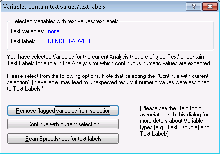 Since the analysis expects continuous variables, but text variables were selected, the Variables contain text values/text labels dialog box is displayed.