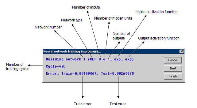 This dialog box provides summary details about the networks being built including the type of network (MLP, RBF or SOFM), the hidden and output activation functions, the training cycle, and the appropriate error terms. For regression tasks, the error term is the average of sum-of-squares error for the network for the train and test (if selected) samples; for classification tasks, the error is the classification rate (that is, the percentage of correctly classified cases for train and test samples).