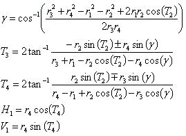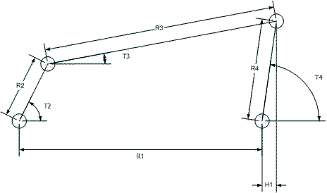 The data set contains a sample of the so called 4-bar linkage (see schematic above). The figure shows the main variables of the physical model, including the 4-bar lengths R1, R2, R3, R4, and the angle T2 as the input variables, and four target variables T3, T4, H1, and V1. The targets are related to the inputs via the following equations: