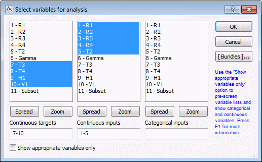 - On the Quick tab, click the Variables button to display a standard three-variable selection dialog box. For Continuous targets, select T3, T4, H1, and V1, and for the Continuous inputs select the primary input variables R1, R2, R3, R4, and T2.