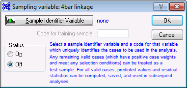 - For the training sample, select Train and click OK to close this dialog box and return to the Sampling variable dialog box. Select the On option button in the Status group box. The dialog box should look as follows.