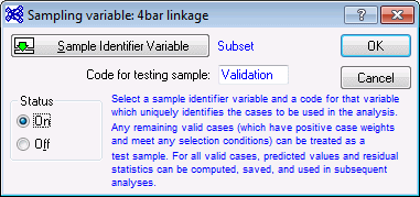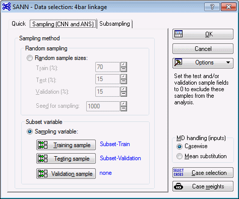 - In SANN, the assignment of the cases to the subsets can be performed randomly or based upon a special subset variable in the data set. The 4bar linkage.sta file already contains a subset variable that splits the data into two subsets. We will use this variable to specify a training subset and a testing subset.