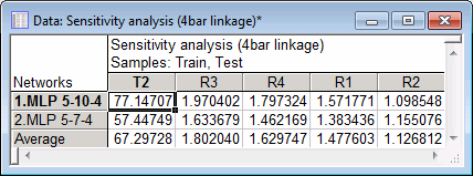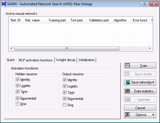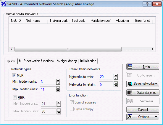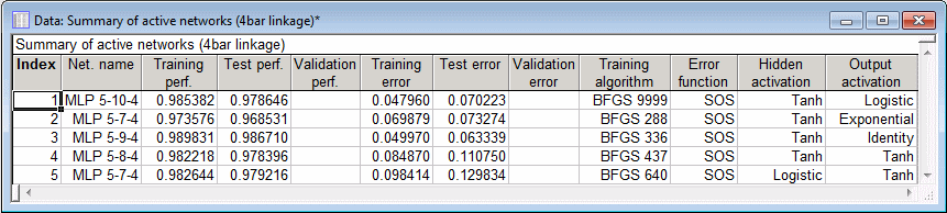 The two networks are saved as 4barlinkage-1.xml and 4barlinkage-2.xml. After you have saved the networks, close this analysis by right-clicking on the SANN - Results button on the analysis bar (located at the bottom of the Statistica window) and selecting Close.