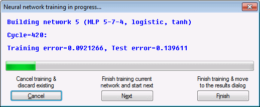 Now, click the Train button. During training, the Neural network training in progress dialog box is displayed, which provides summary details about the networks being built including the type of network, the activation functions, the training cycle, and the appropriate error terms.