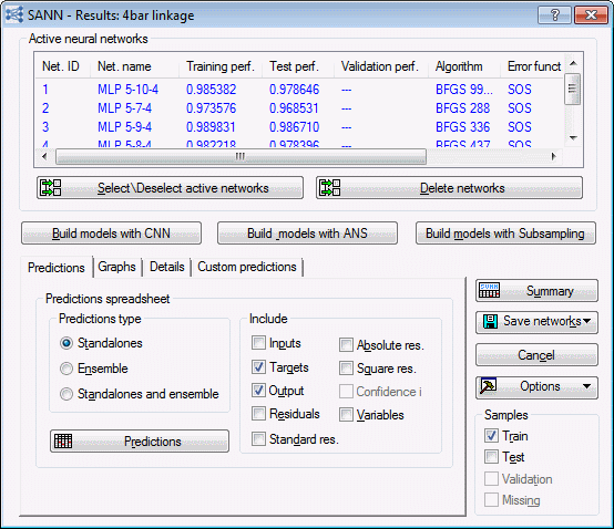 The SANN - Results dialog box provides a variety of options for generating predictions and graphs and for reviewing network properties. The Active neural networks grid at the top of the dialog box enables you to quickly compare the training and testing performance for each of the selected networks and provides additional summary information about each model including the algorithm used in training and the error function and activation functions used for the hidden and output layers. To generate a spreadsheet of the information in the Active neural networks grid, click the Summary button.