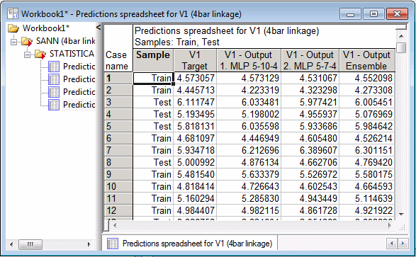 - This spreadsheet shows the predictions (output) for V1. Note that in addition to the predictions of the individual networks, the spreadsheet also contains (last column) the outputs of the ensemble, which is computed by simple averaging over the outputs of the standalone networks. It is highly recommended that you combine networks to form ensembles, especially when the size of the training set is small. Ensembles of well trained networks, in general, perform better than the individual members.