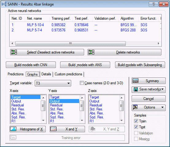 - Select the Graphs tab of the SANN - Results dialog box. You can use the options on this tab to create histograms, 2D scatterplots, and 3D surface plots using targets, predictions, residuals, and inputs.