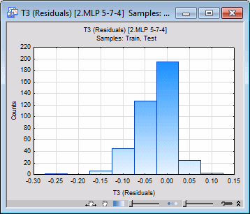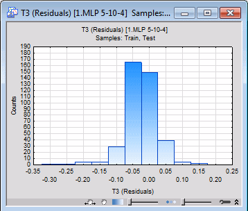 - For example, to review the distribution of the network residuals (that is, differences between the targets and their predicted values) of a target variable, say T3, select T3 from the Target variable drop-down list, and then select Residual in the X-axis list, and finally click the Histograms of X button.