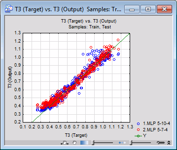 - You can use this graph to visually inspect how well a target is related to the network outputs by observing how close the graph is to the 45-degree line that is also displayed in the scatterplot. In fact, the graph is nothing more than a visualization of the correlation coefficient, which plays a central role in network selection. Note that most points of the scatterplot of the individual networks does not lie exactly on the 45-degree line. That is because the networks have recognized some noise on the target values and have avoided modeling them as true signals, which is a desired result.