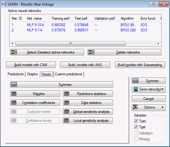 The Details tab provides access to additional information – per sample when appropriate – about the networks. For example, you can review the spreadsheet of weights for the individual networks or review the correlation coefficients for the various subsets (training, testing). You can also review the statistics of both data and predictions. Most important of all, you can carry out a sensitivity analysis.