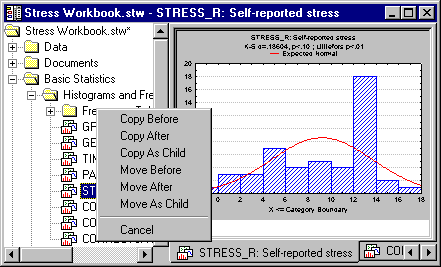 The Statistica Workbook supports an entire range of drag-and-drop features within the workbook tree. By right-clicking on an item in the workbook tree, you can drag that item to a new location within the tree. In fact, since the drag-and-drop features support parent/child relationships, you can use these features to rearrange large portions of the workbook tree.