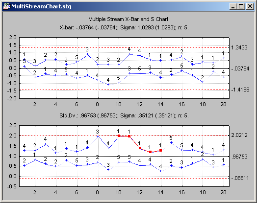 You can create multiple stream charts by overlaying the extreme plot points across data streams from standard univariate X, X-Bar, Range (R), Moving Range (MR), or Standard deviation (S) charts. The information contains runs of consecutive extreme values like standard deviations, or ranges observed from a particular process. This information is displayed on multiple stream charts and can be easily translated into actionable information that helps to determine which specific process and data stream are responsible for an unexpectedly large number of extreme values.