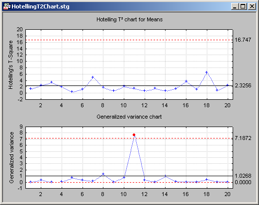 The Hotelling T2 is a distance chart, and the plotted points (T2) indicate the distance of mean vectors (samples) from the center point (vector of centerline values, or means) in multivariate space. The Hotelling T2 chart can detect small movements or drifts in multivariate space that cannot be picked up at an earlier stage using simple univariate control charting. For more details, see General Approach. Hence, Hotelling T2 charts can provide a more sensitive and powerful control method for large numbers of variables, detecting even small shifts or drift that simultaneously affect the variables.