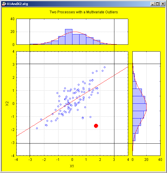 Two variables, X1 and X2, are shown. Both variables follow normal distribution, and it is apparent that the standard +/- 3 times sigma control lines, applied to each individual variable, does not detect any quality problems (outliers) for either one of the two variables.