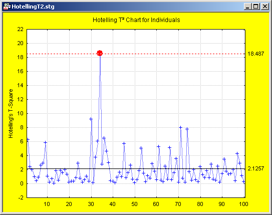 However, if the same data are charted in a Hotelling T2 chart, at least one multivariate outlier is detected.