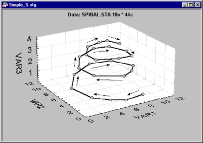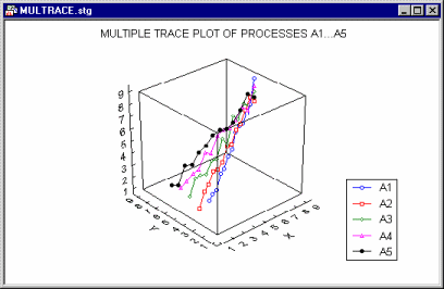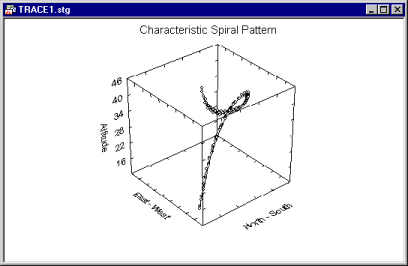 As in 3D Scatterplots, each data point in a trace plot is represented by its location in 3D space as determined by the values of the variables selected as X, Y, and Z (and interpreted as the X, Y, and Z axis coordinates). The data points are then connected sequentially (in the order encountered in the datafile) with a line to form a "trace" of a sequential process (e.g., movement, change of a phenomenon over time, etc.).
