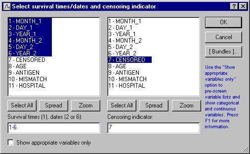 Variables button to display the standard variable selection dialog box. Here, select the first 6 variables as the Survival times (1), dates (2 or 6). As explained above,