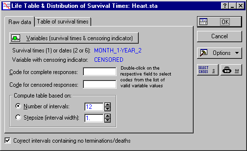 - In addition, you can specify the Number of intervals for the life table, or the Stepsize (interval width). You can also specify whether the intervals in which there are no deaths/terminations are adjusted so that survival distributions can be fitted by selecting the Correct intervals containing no terminations/deaths check box when fitting survival distributions, and clearing this check box when generating a life table for descriptive purposes only.