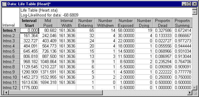 In this example, you compute a life (survival) table for these data, estimate the survival, probability, and hazard functions for different time intervals, and see which theoretical distribution best fits the survival function. See Survival Analysis Examples - Overview and Data File for a description of the data file used in this example.