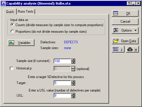 On the Quick tab, select Capability analysis - Binomial, and click the OK button. We choose the binomial distribution for this case because the defects are independent defect counts from fixed samples of bulbs; further, each bulb has an a-priori equal probability of failing.