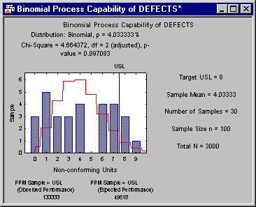 You may repeat this analysis using the Poisson distribution, which yields a slightly better fit to these data, and a similar estimate of process capability.