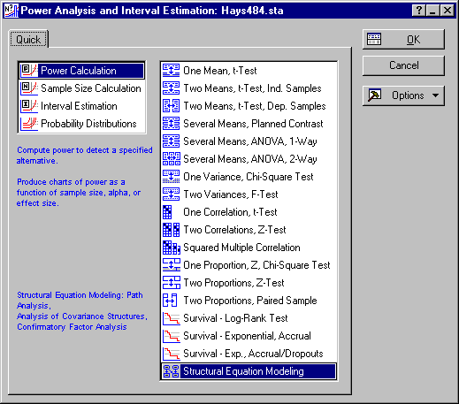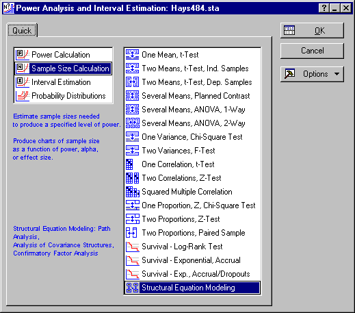 From the Startup Panel, select Sample Size Calculation and Structural Equation Modeling.