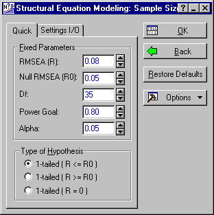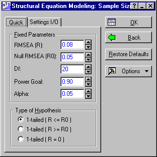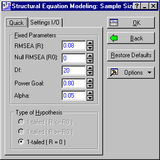 Click the Back button on both the Structural Equation Modeling: Power Calc. Results and the Structural Equation Modeling: Power Calculation Parameters dialog boxes to return to the Startup Panel. Here, select Sample Size Calculation and Structural Equation Modeling and then click the OK button to display the Structural Equation Modeling: Sample Size Parameters dialog box. Enter 0 in the Null RMSEA (R0) box and make sure the Power Goal is .80. Note that the Type of Hypothesis automatically changes to 1-tailed (R = 0).