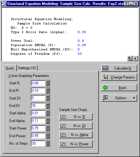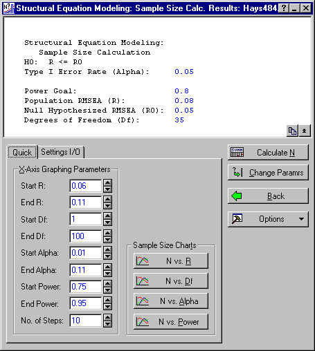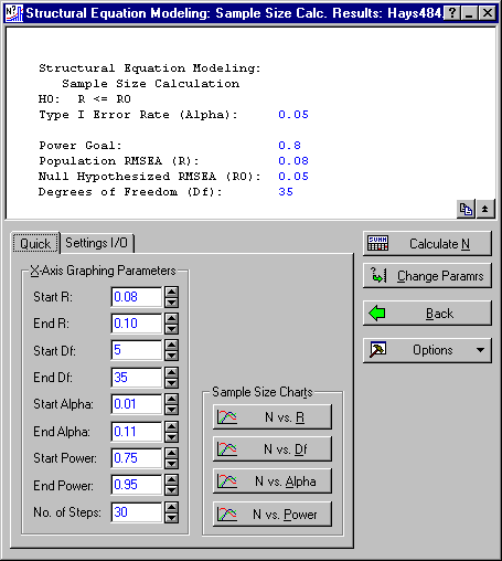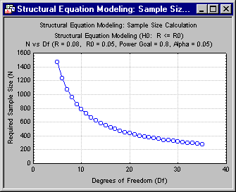 Click the OK button to display the Structural Equation Modeling: Sample Size Calc. Results dialog box. Enter 5 in the Start Df box, and 35 in the End Df box.